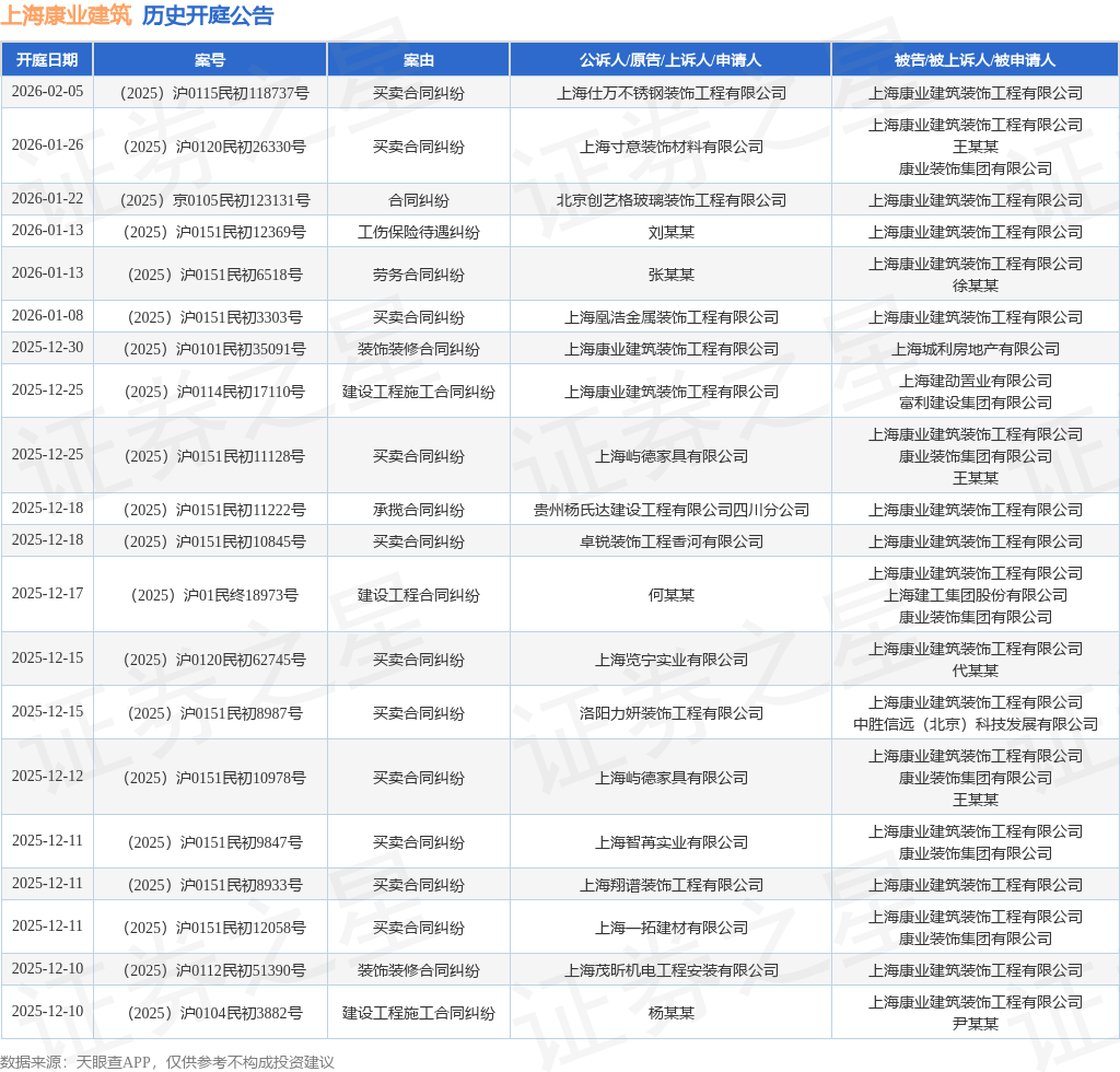 案号:(2025)沪0151民初8936号根据统计,近一年内以上海康业建筑装饰工程有限公司为当事人的历史开庭公告有113则,其中案由为“买卖合同纠纷”的公告以36则居首,其次为“劳务合同纠纷”有14则,“装饰装修合同纠纷”有10则。历史开庭公告(前20条)如下: