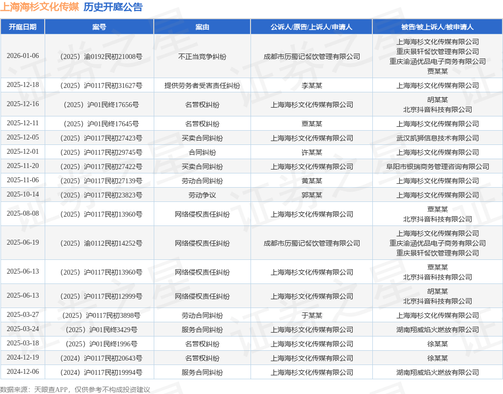 证券之星消息,根据天眼查APP显示,近日公布了一则上海海杉文化传媒有限公司作为原告/上诉人的开庭公告,详细内容如下: