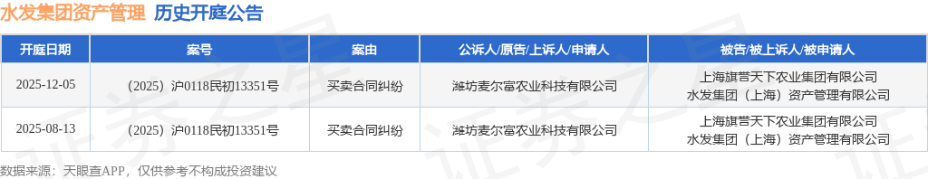 根据统计,近一年内以水发集团(上海)资产管理有限公司为当事人的历史开庭公告有2则,其中案由为“买卖合同纠纷”的公告以2则居首。历史开庭公告如下: