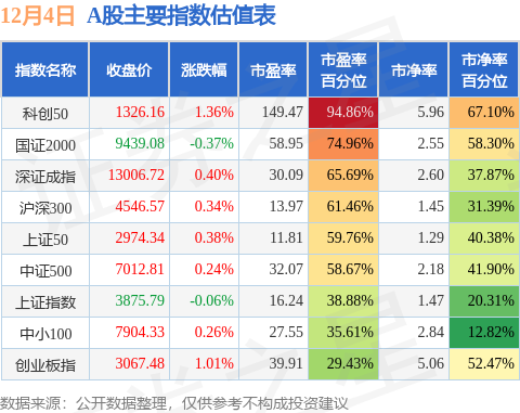 A股主要宽基指数方面,科创50的市盈率百分位较高,为94.86%。而创业板指的市盈率百分位较低,为29.43%。
