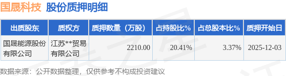 证券之星消息,国晟科技(603778)12月5日公开信息显示,股东国晟能源股份有限公司向江苏**贸易有限公司合计质押2210.0万股,占总股本3.37%。质押详情见下表: