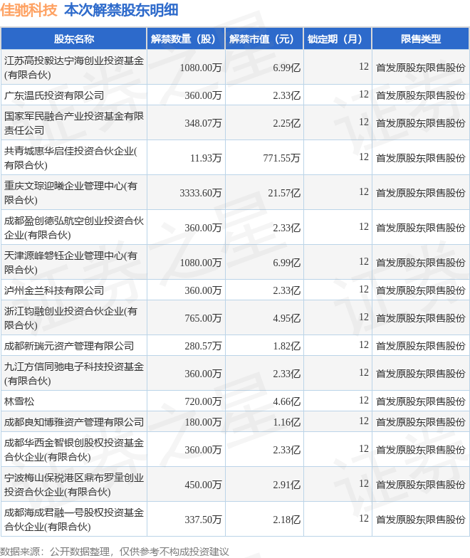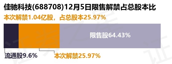 证券之星消息,根据市场公开信息整理,佳驰科技(688708)于12月5日将有1.04亿股限售股份解禁,为公司首发原股东限售股份,占公司总股本25.97%。(本次数据根据历史公告整理得出,实际情况以上市公司最新公告为准)最近一年内,该股累计解禁269.9万股,占总股本的0.67%。本次解禁后,公司还有2.58亿股限售股份,占总股本64.43%。具体如下图所示:
