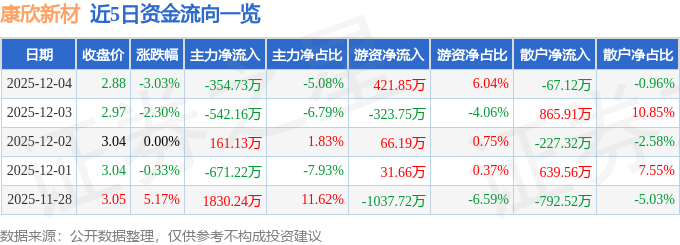 证券之星消息,截至2025年12月4日收盘,康欣新材(600076)报收于2.88元,下跌3.03%,换手率1.79%,成交量24.05万手,成交额6982.54万元。