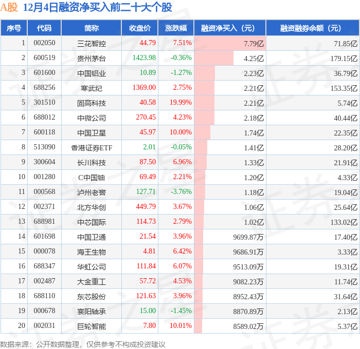 A股融资净买入前三分别为:三花智控(002050)融资净买入7.79亿元、贵州茅台(600519)融资净买入4.25亿元、中国铝业(601600)融资净买入2.23亿元,前20具体见下表: