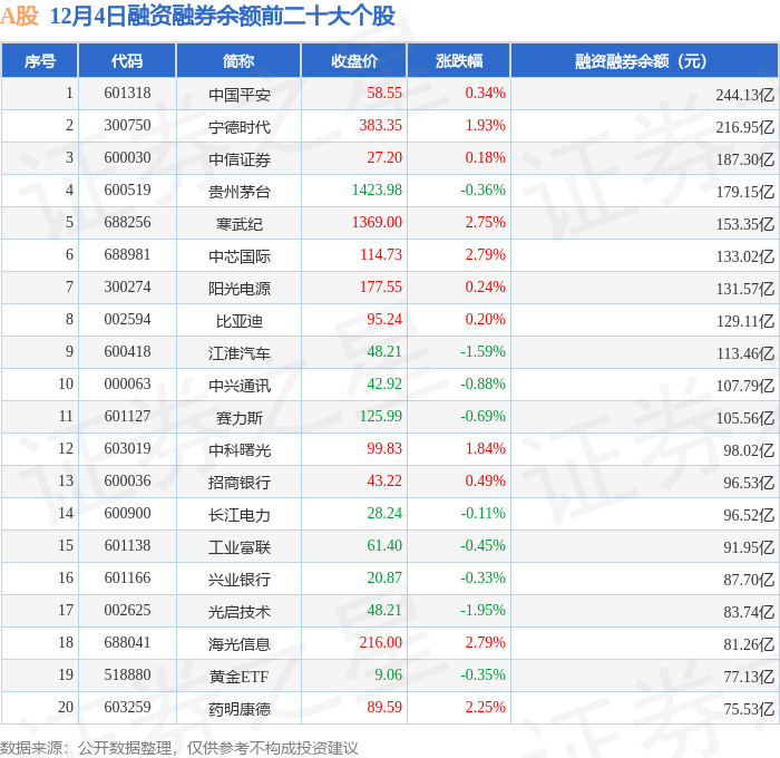 A股融资融券余额前三分别为:中国平安(601318)融资融券余额244.13亿元、宁德时代(300750)融资融券余额216.95亿元、中信证券(600030)融资融券余额187.3亿元,前20具体见下表: