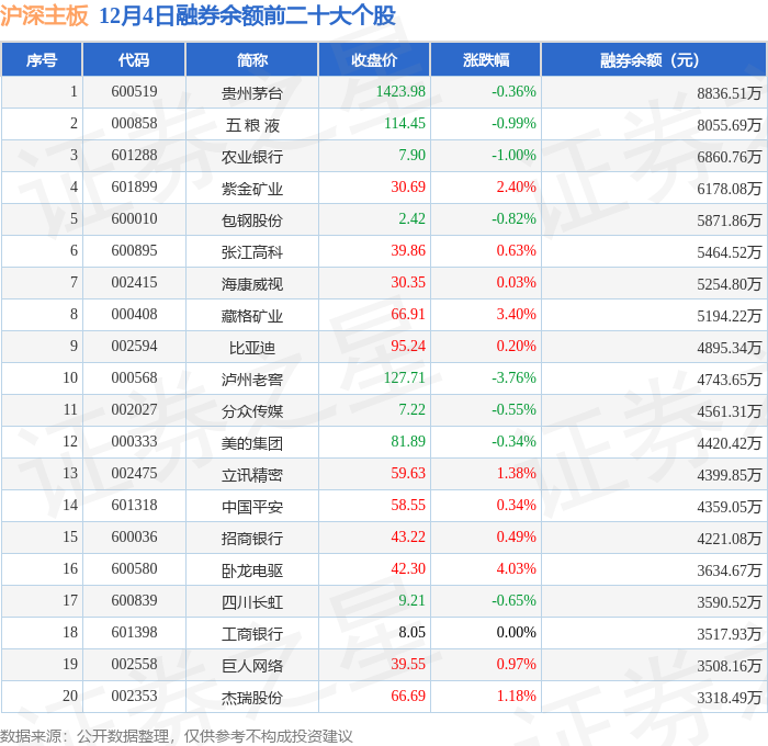沪深主板融券余额前三分别为:贵州茅台(600519)融券余额8836.51万元、五 粮 液(000858)融券余额8055.69万元、农业银行(601288)融券余额6860.76万元,前20具体见下表: