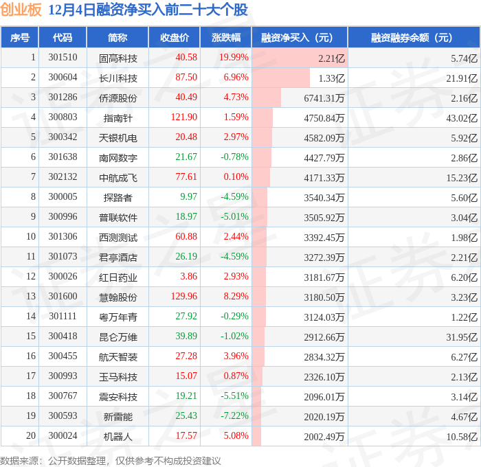 创业板融资净买入前三分别为:固高科技(301510)融资净买入2.21亿元、长川科技(300604)融资净买入1.33亿元、侨源股份(301286)融资净买入6741.31万元,前20具体见下表: