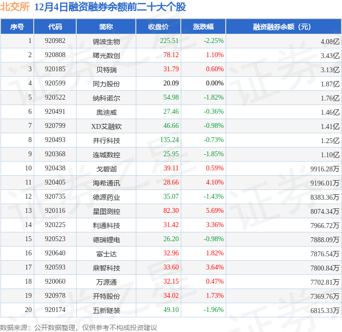 北交所融资融券余额前三分别为:锦波生物(920982)融资融券余额4.08亿元、曙光数创(920808)融资融券余额3.43亿元、贝特瑞(920185)融资融券余额3.13亿元,前20具体见下表: