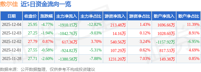 证券之星消息,截至2025年12月4日收盘,敷尔佳(301371)报收于25.95元,下跌4.77%,换手率7.32%,成交量5.67万手,成交额1.49亿元。