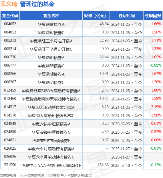 武文琦女士:硕士。2016年7月加入华夏基金管理有限公司,历任研究员、基金经理助理,现任华夏30天滚动持有短债债券型发起式证券投资基金基金经理(2024年11月25日起任职)、华夏稳鑫增利80天滚动持有债券型证券投资基金基金经理(2024年11月25日起任职)、华夏鼎旺三个月定期开放债券型发起式证券投资基金基金经理(2024年11月25日起任职)、华夏鼎略债券型证券投资基金基金经理(2024年11月25日起任职)、华夏鼎智债券型证券投资基金基金经理(2024年11月25日起任职)、华夏鼎明债券型证券投资基金基金经理(2024年11月25日起任职)、华夏中证AAA科技创新公司债交易型开放式指数证券投资基金基金经理(2025年7月10日起任职)、华夏安裕中短债债券型证券投资基金基金经理(2025年7月25日起任职)、华夏六个月滚动持有债券型证券投资基金基金经理(2025年11月27日起任职)。