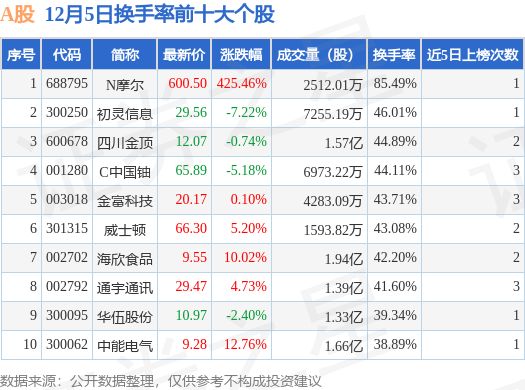 当日A股换手率前10大个股中6只个股收涨,平均涨幅76.38%,其中N摩尔(688795)以换手率85.49%排第一,6只个股近5个交易日中多次上榜。