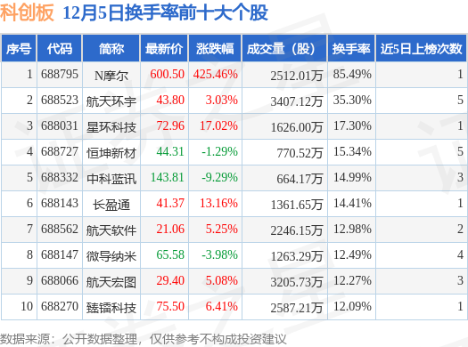 当日科创板换手率前10大个股中7只个股收涨,平均涨幅67.92%,其中N摩尔(688795)以换手率85.49%排第一,6只个股近5个交易日中多次上榜。
