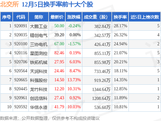 当日北交所换手率前10大个股中7只个股收涨,平均涨幅7.1%,其中大鹏工业(920091)以换手率28.17%排第一,7只个股近5个交易日中多次上榜。