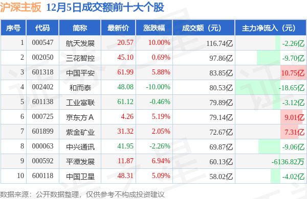 当日沪深主板成交额前10大个股中7只个股收涨,平均涨幅5.12%,其中航天发展(000547)以成交额116.74亿元排第一。从主力资金流入看,成交额前10大个股中有3只个股呈现主力资金净流入。