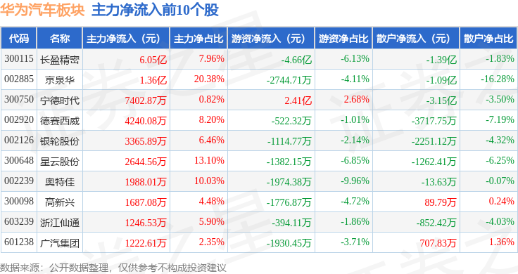 从资金流向上来看,当日华为汽车板块主力资金净流出9.22亿元,游资资金净流入9065.59万元,散户资金净流入8.31亿元。华为汽车板块个股资金流向见下表: