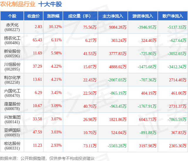 个股表现方面,农化制品行业当日领涨股为赤天化(600227),该股当日报收2.83,上涨10.12%,成交量75.56万,主力资金净流入9084.28万元。扬农化工(600486)以上涨6.11%紧随其后,该股当日成交量6.27万,主力资金净流入303.24万元。除此之外,新安股份(600596)、川恒股份(002895)、利尔化学(002258)均进入当日牛股之列。具体个股列表见下表:
