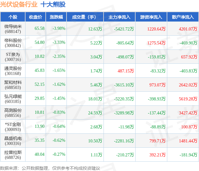 个股表现方面,光伏设备行业当日领跌股为微导纳米(688147),该股当日报收65.58,下跌3.98%,成交量12.63万,主力资金净流出5421.72万元。帝科股份(300842)以下跌3.33%紧随其后,该股当日成交量5.22万,主力资金净流出805.64万元。除此之外,ST泉为(300716)、通灵股份(301168)、聚和材料(688503)均进入当日熊股之列。具体个股列表见下表: