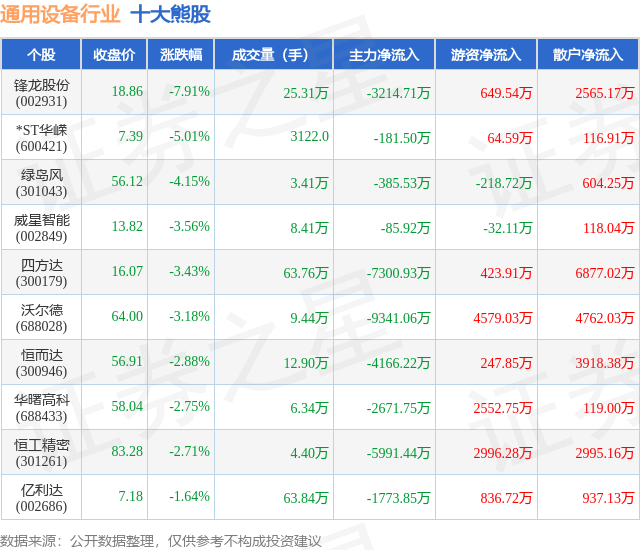 个股表现方面,通用设备行业当日领跌股为锋龙股份(002931),该股当日报收18.86,下跌7.91%,成交量25.31万,主力资金净流出3214.71万元。*ST华嵘(600421)以下跌5.01%紧随其后,该股当日成交量3122.0,主力资金净流出181.5万元。除此之外,绿岛风(301043)、威星智能(002849)、四方达(300179)均进入当日熊股之列。具体个股列表见下表: