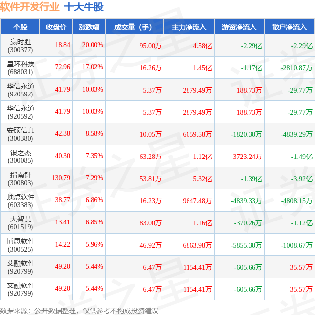 个股表现方面,软件开发行业当日领涨股为赢时胜(300377),该股当日报收18.84,上涨20.0%,成交量95.0万,主力资金净流入4.58亿元。星环科技(688031)以上涨17.02%紧随其后,该股当日成交量16.26万,主力资金净流入1.45亿元。除此之外,华信永道(920592)、华信永道(920592)、安硕信息(300380)均进入当日牛股之列。具体个股列表见下表: