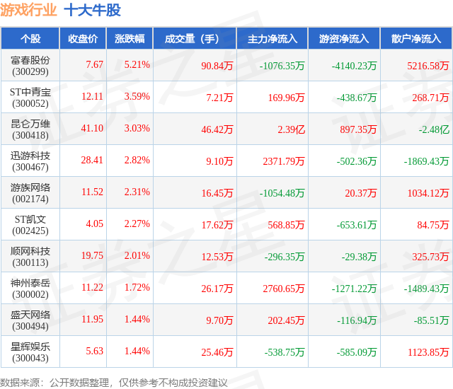 个股表现方面,游戏行业当日领涨股为富春股份(300299),该股当日报收7.67,上涨5.21%,成交量90.84万,主力资金净流出1076.35万元。ST中青宝(300052)以上涨3.59%紧随其后,该股当日成交量7.21万,主力资金净流入169.96万元。除此之外,昆仑万维(300418)、迅游科技(300467)、游族网络(002174)均进入当日牛股之列。具体个股列表见下表: