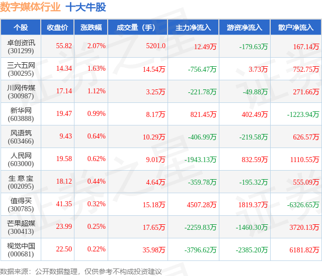 个股表现方面,数字媒体行业当日领涨股为卓创资讯(301299),该股当日报收55.82,上涨2.07%,成交量5201.0,主力资金净流入12.49万元。三六五网(300295)以上涨1.63%紧随其后,该股当日成交量14.54万,主力资金净流出756.47万元。除此之外,川网传媒(300987)、新华网(603888)、风语筑(603466)均进入当日牛股之列。具体个股列表见下表: