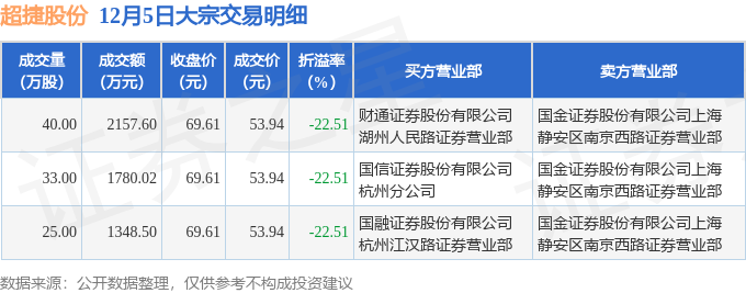 证券之星消息,12月5日超捷股份发生大宗交易,交易数据如下:
