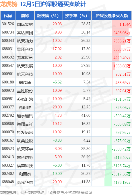 龙虎榜中有沪股通/深股通专用席位(北向资金)现身的个股共22家,其中国际复材以净买入1.13亿元排名第一。详情见下表: