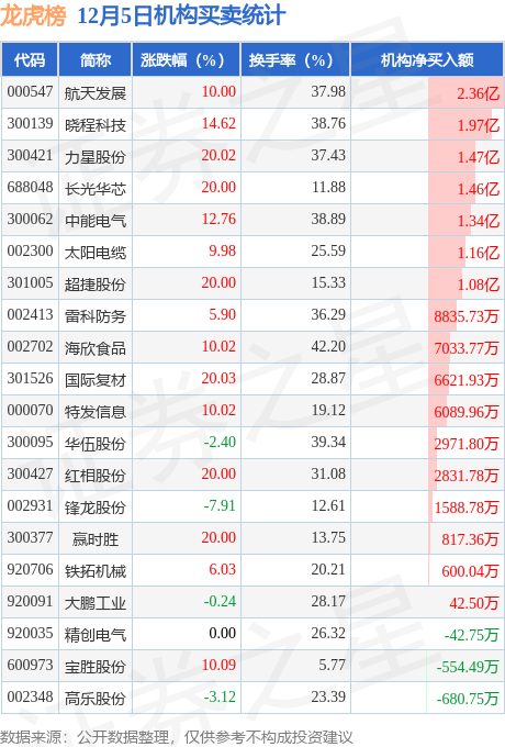 当日公布的交易所龙虎榜中有机构专用席位现身的个股共34家,其中航天发展以净买入2.36亿元排名第一。详情见下表: