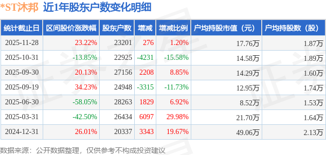 从股价来看,2025年10月31日至2025年11月28日,*ST沐邦区间涨幅为23.22%,在此期间股东户数增加276.0户,增幅为1.2%。