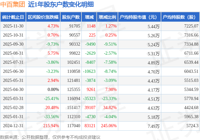 从股价来看,2025年10月31日至2025年11月30日,中百集团区间涨幅为4.73%,在此期间股东户数增加1148.0户,增幅为1.27%。