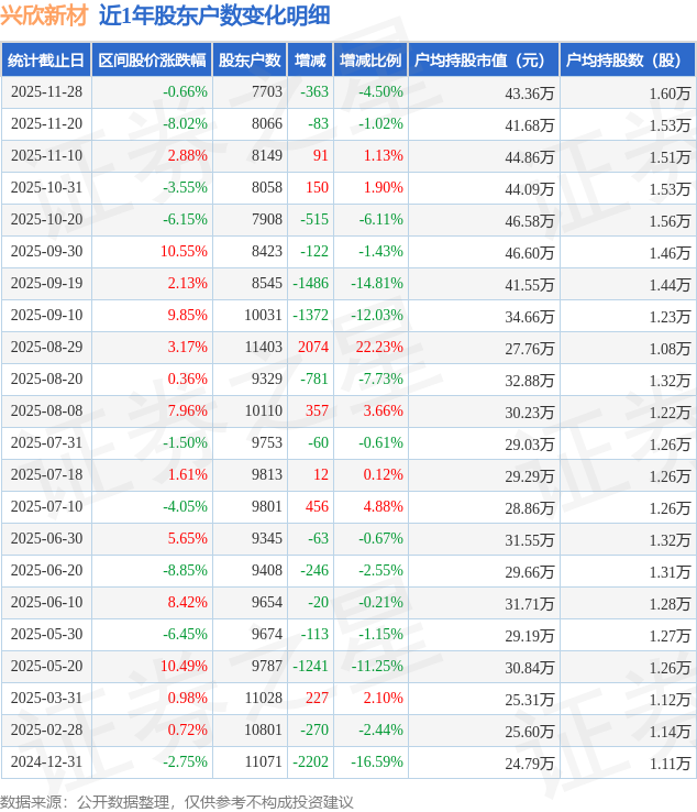 从股价来看,2025年11月20日至2025年11月28日,兴欣新材区间跌幅为0.66%,在此期间股东户数减少363.0户,减幅为4.5%。