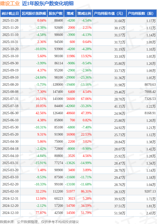 从股价来看,2025年11月20日至2025年11月28日,建设工业区间涨幅为0.04%,在此期间股东户数减少4200.0户,减幅为4.54%。