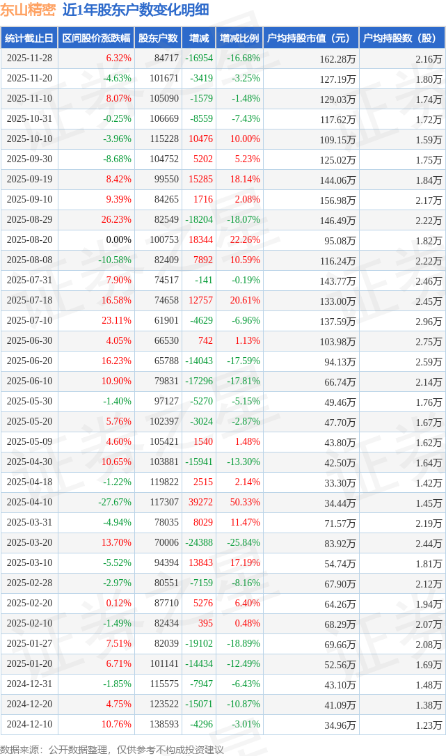 从股价来看,2025年11月20日至2025年11月28日,东山精密区间涨幅为6.32%,在此期间股东户数减少1.7万户,减幅为16.68%。