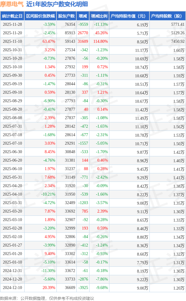 从股价来看,2025年11月20日至2025年11月28日,摩恩电气区间跌幅为3.59%,在此期间股东户数减少9559.0户,减幅为11.13%。