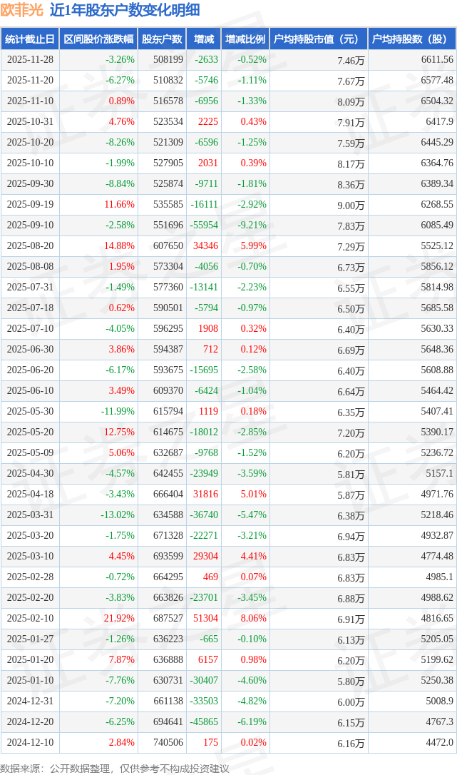 从股价来看,2025年11月20日至2025年11月28日,欧菲光区间跌幅为3.26%,在此期间股东户数减少2633.0户,减幅为0.52%。