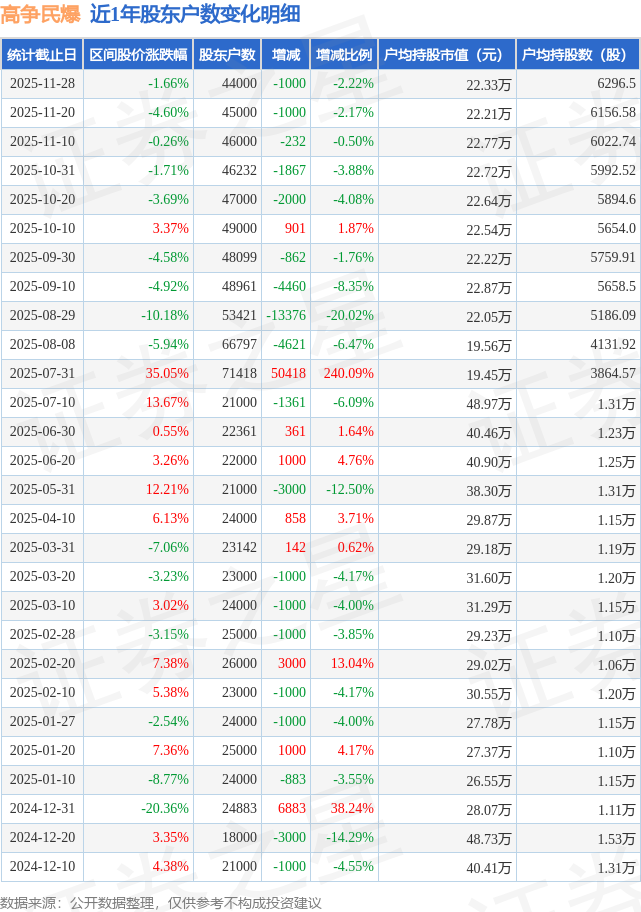 从股价来看,2025年11月20日至2025年11月28日,高争民爆区间跌幅为1.66%,在此期间股东户数减少1000.0户,减幅为2.22%。