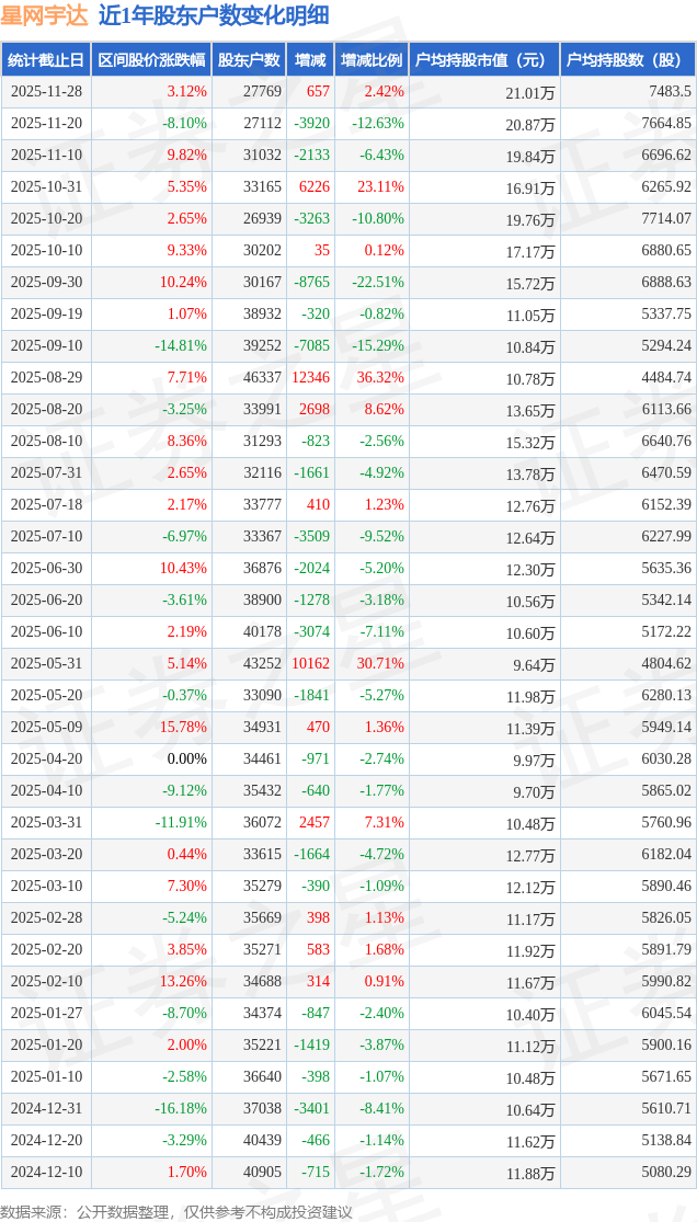 从股价来看,2025年11月20日至2025年11月28日,星网宇达区间涨幅为3.12%,在此期间股东户数增加657.0户,增幅为2.42%。