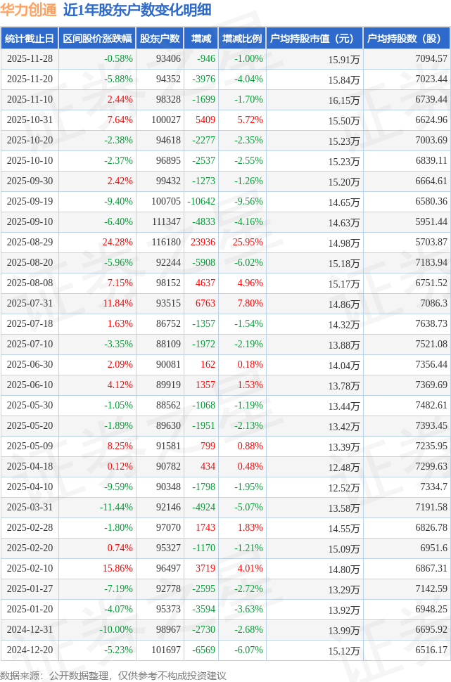 从股价来看,2025年11月20日至2025年11月28日,华力创通区间跌幅为0.58%,在此期间股东户数减少946.0户,减幅为1.0%。
