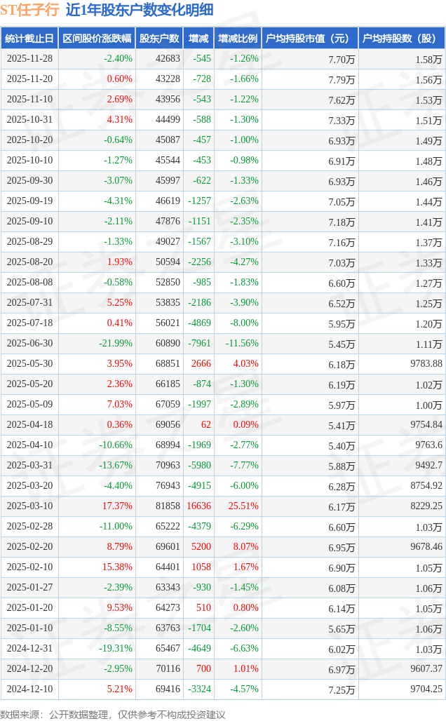 从股价来看,2025年11月20日至2025年11月28日,ST任子行区间跌幅为2.4%,在此期间股东户数减少545.0户,减幅为1.26%。