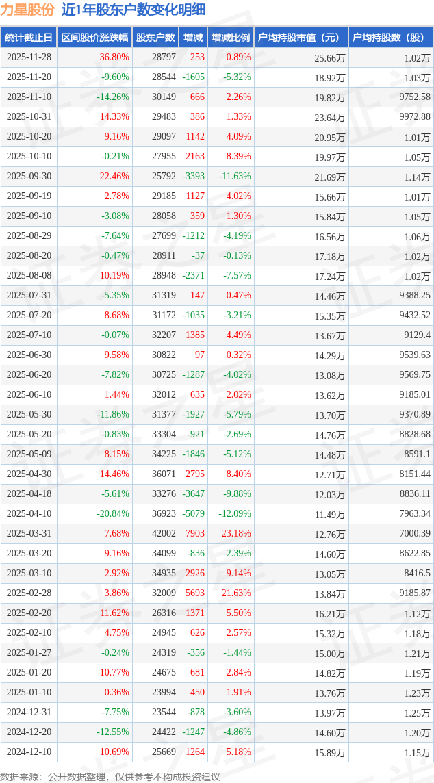 从股价来看,2025年11月20日至2025年11月28日,力星股份区间涨幅为36.8%,在此期间股东户数增加253.0户,增幅为0.89%。
