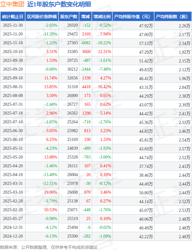 从股价来看,2025年11月20日至2025年11月30日,立中集团区间跌幅为2.03%,在此期间股东户数减少152.0户,减幅为0.52%。