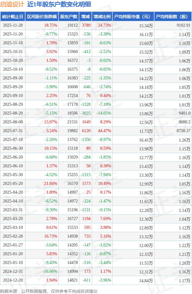从股价来看,2025年11月20日至2025年11月28日,启迪设计区间涨幅为18.75%,在此期间股东户数增加3789.0户,增幅为24.73%。
