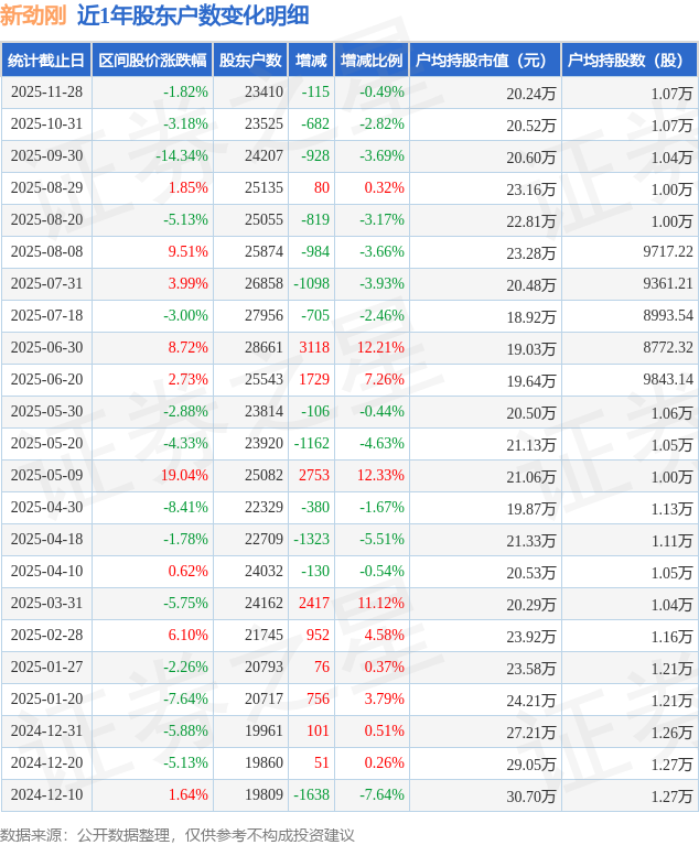 从股价来看,2025年10月31日至2025年11月28日,新劲刚区间跌幅为1.82%,在此期间股东户数减少115.0户,减幅为0.49%。