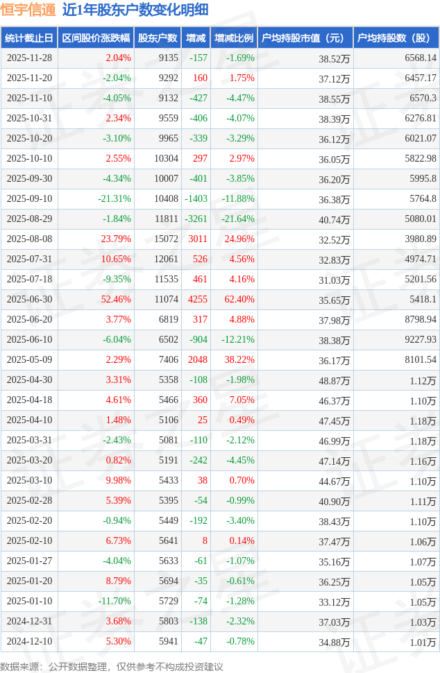 从股价来看,2025年11月20日至2025年11月28日,恒宇信通区间涨幅为2.04%,在此期间股东户数减少157.0户,减幅为1.69%。