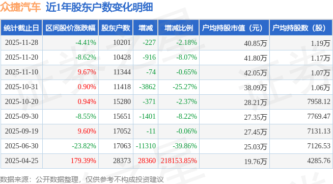 从股价来看,2025年11月20日至2025年11月28日,众捷汽车区间跌幅为4.41%,在此期间股东户数减少227.0户,减幅为2.18%。