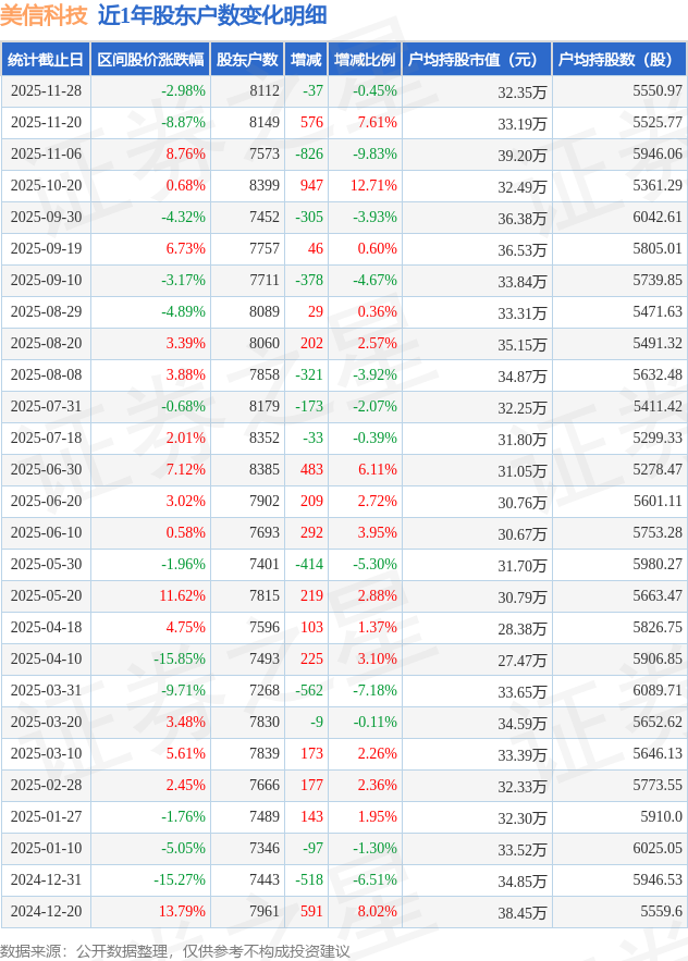 从股价来看,2025年11月20日至2025年11月28日,美信科技区间跌幅为2.98%,在此期间股东户数减少37.0户,减幅为0.45%。