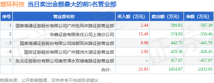 证券之星消息,沪深交易所2025年12月5日公布的交易公开信息显示,楚环科技(001336)因日跌幅偏离值达到7%的前5只证券登上龙虎榜。此次是近5个交易日内第2次上榜。