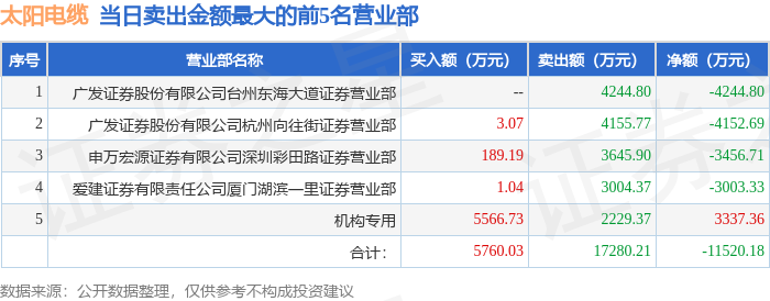 证券之星消息,沪深交易所2025年12月5日公布的交易公开信息显示,太阳电缆(002300)因日振幅值达到15%的前5只证券,日涨幅偏离值达到7%的前5只证券登上龙虎榜。此次是近5个交易日内第2次上榜。