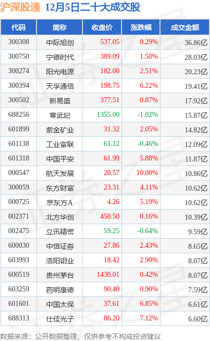 当日北向资金余额额度充足,苏豪汇鸿(600981)领涨,涨幅10.09%,交易所公布的沪深股通二十大成交股中成交额前三的为中际旭创、宁德时代、阳光电源,成交额分别为36.86亿元、28.03亿元、20.23亿元。详情可见下表: