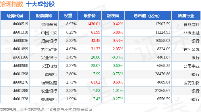 证券之星消息,12月5日,治理指数(000019)报收于1226.93点,涨0.96%,成交1373.52亿元,换手率0.39%。当日该指数成份股中,上涨的有213家,安记食品以10.0%的涨幅领涨,下跌的有79家,天普股份以6.76%的跌幅领跌。